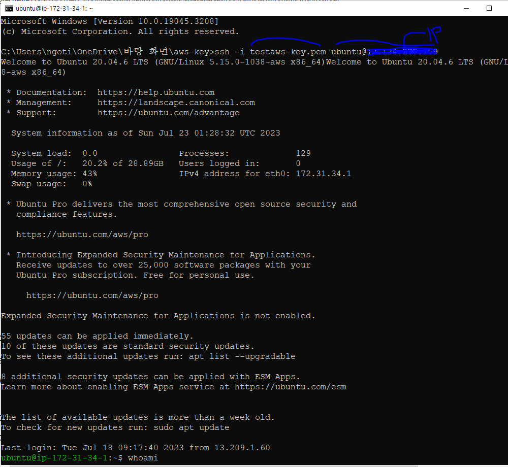 - ssh -i pem파일명 접속하는username@퍼블릭IP주소