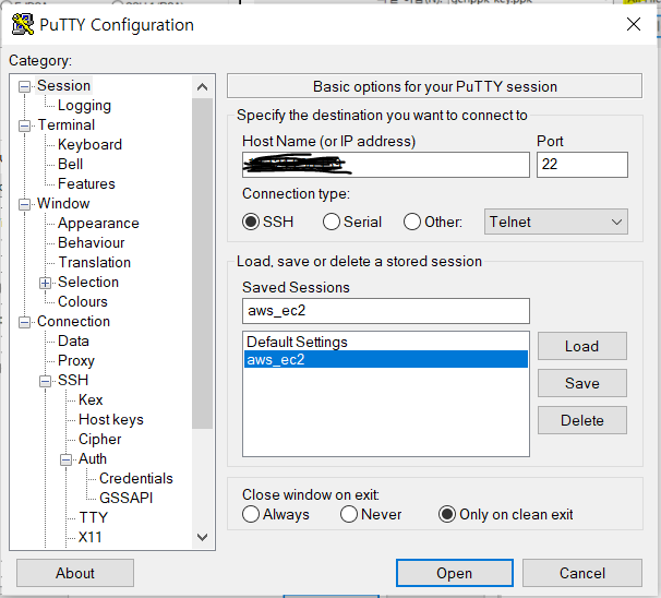- Session 탭에서 Host Name에 접속하려는 EC2 public IP를 입력하고 Open하면 연결이 되는데 Saved Sessions에 새션 이름을 입력하여 연결 설정을 저장할 수 있다.