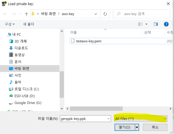 - puttygen을 실행시켜서 load버튼을 눌르고 All Files로 파일 종류를 바꾸고 pem파일을 로드한다.
