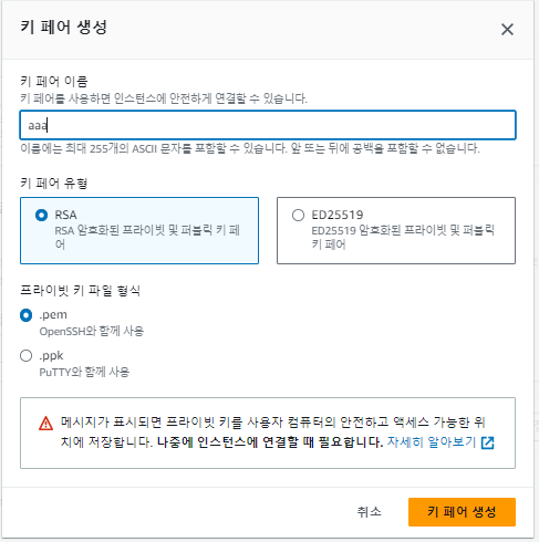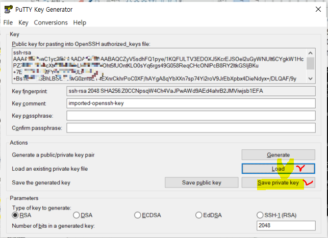 - Save private key버튼을 눌러서 적당한 파일이름으로 저장