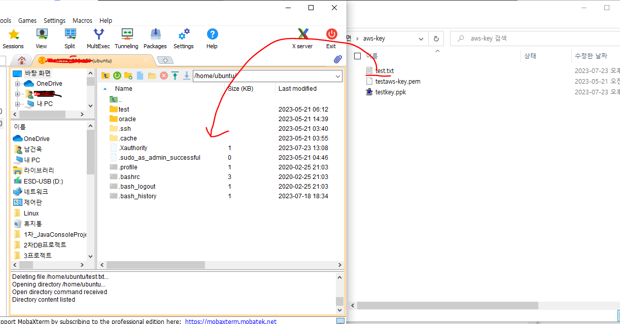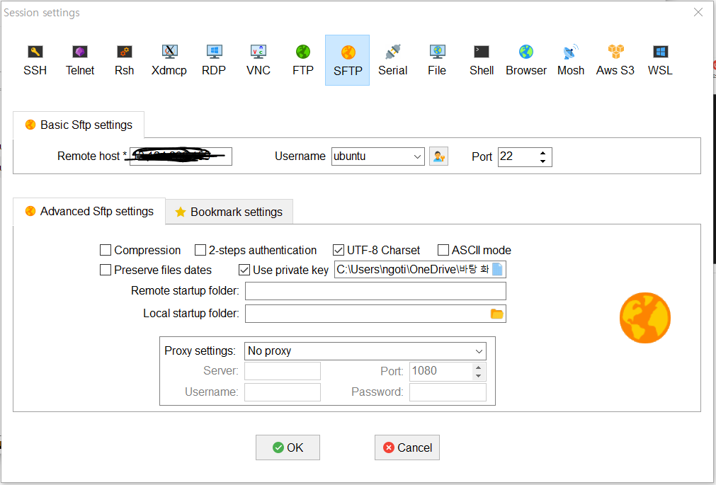 mobaXterm에서는 SFTP라는 기능을 제공한다. 이것은 SSH File Transfer Protocol의 약자로 SSH가 이미 설치된 상태이기 때문에 바로 사용이 가능하다. SFTP를 아래 화면 처럼 선택하고 public IP주소와 private key를 넣어주면 마찬가지로 SFTP창이 열린다.