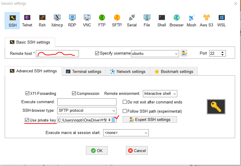 Session settings 창이 뜨는게 저기에 public IP를 입력하고 username을 ubuntu라고 명시한 후 Use private Key를 체크하고 pem파일을 로드하면 접속이 된다.