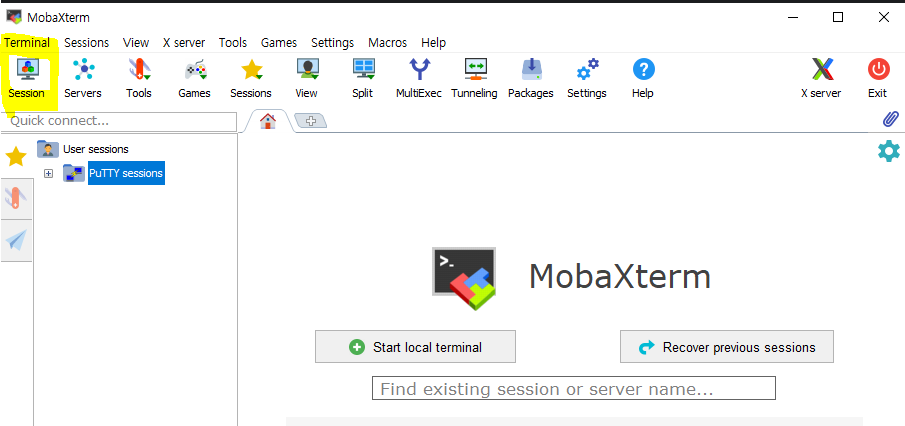 mobaXterm을 실행해보면 GUI 형태로 뭔가 이것저것 기능이 많다는 것을 바로 확인할 수 있다. 접속하기 위해선 Session 아이콘을 클릭하면 된다.