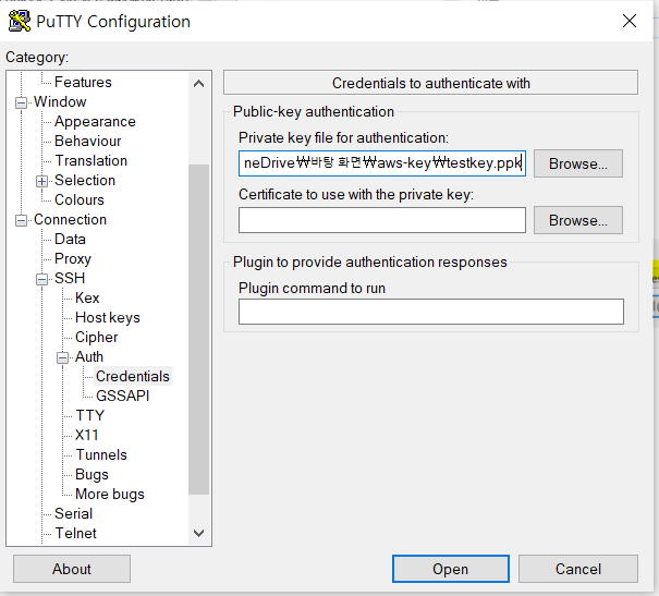 - Connection > SSH > Auth > Credentials > Private key file을 등록한다.