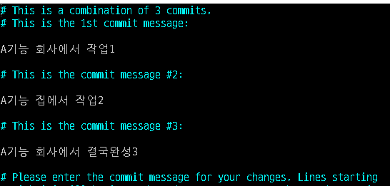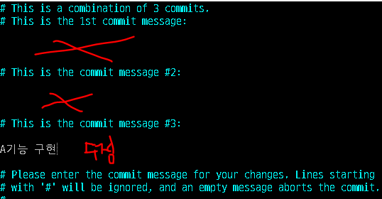 - 커밋 메세지 3개 중에 2개를 지우고 마지막 커밋 메세지를 알맞게 수정한다.(3개중 아무거나 하나 남기면 됨) 그리고 wq로 저장한다.