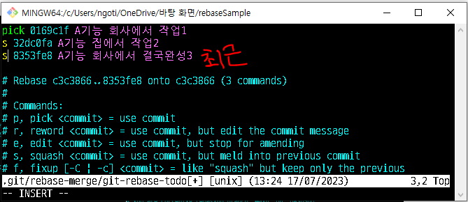 - 이러면 3개의 커밋을 가장 오래전에 한 commit으로 합치겠다는 말이다.