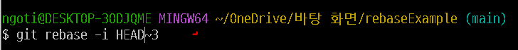 이때 사용하는 명령은 git rebase -i HEAD~3 이렇게 입력하면 된다. i 옵션은 여러개의 커밋 목록을 묶을 때 사용하고 HEAD 지점에서 3개의 커밋에 대한 rebase를 한다는 것이다. (커밋을 합치는것 뿐만 아니라 분리도 가능하다고 한다.)