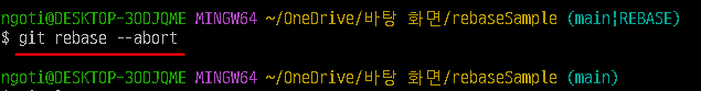 - 만약에 rebase를 잘못 사용한 경우 git reflog로 되돌리고 아래처럼 git rebase --abort로 rebase를 제거한다.